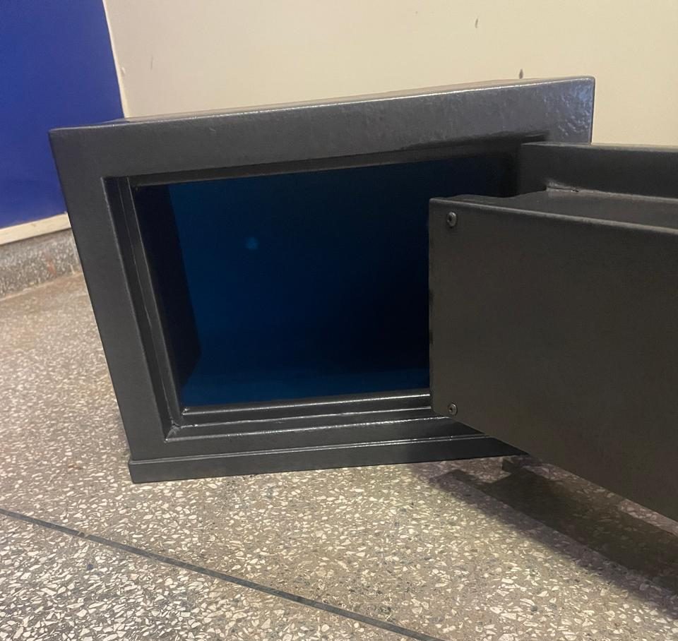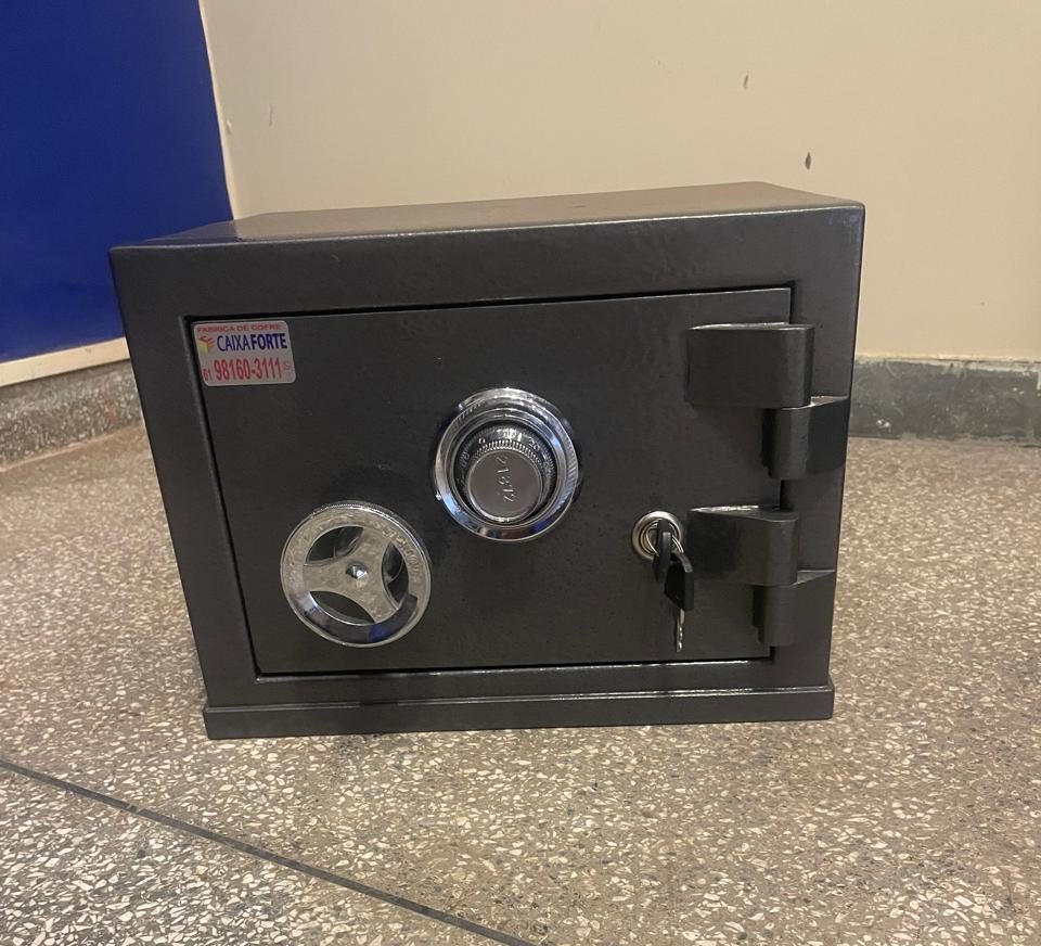 —Características:* Fabricado em aço * furos na na parte anterior para fixação* segredo de 06 números* uma chave e uma cópia* forrado internamente com carpete azul